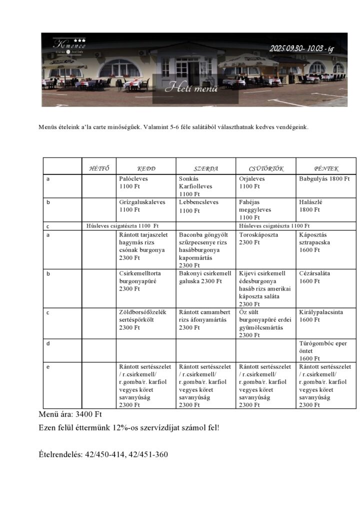 Kemence Csárda heti menü ajánlat